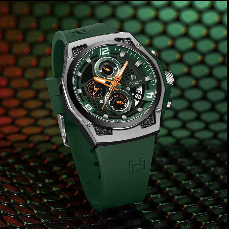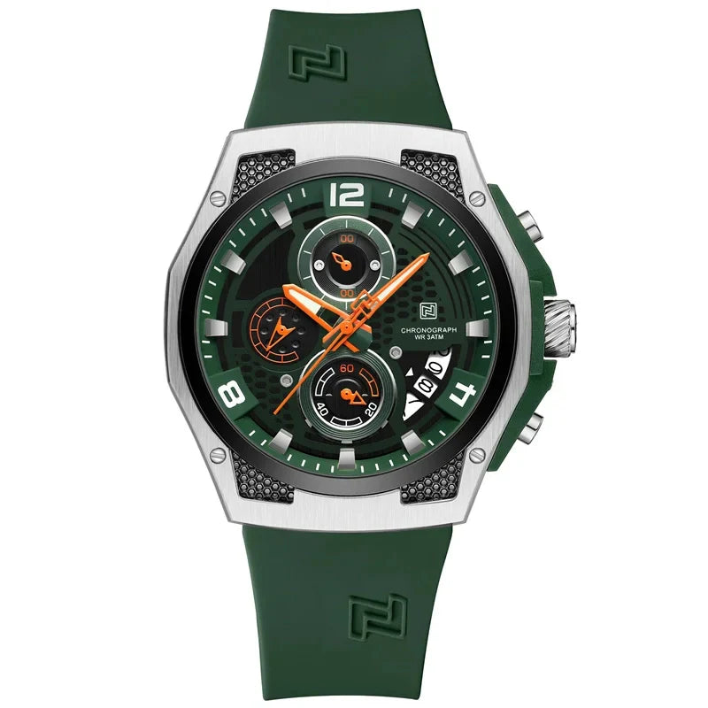 Modern tasarımıyla dikkat çeken bu saat, yeşil silikon kordon ve çelik kasanın güçlü birleşimi sayesinde hem dayanıklılık hem de konfor sunar. Turuncu akrep-yelkovan detayları, dinamik bir enerji katarken; çok fonksiyonlu kronograf yapısı ile zamanı en hassas şekilde takip etmeni sağlar.