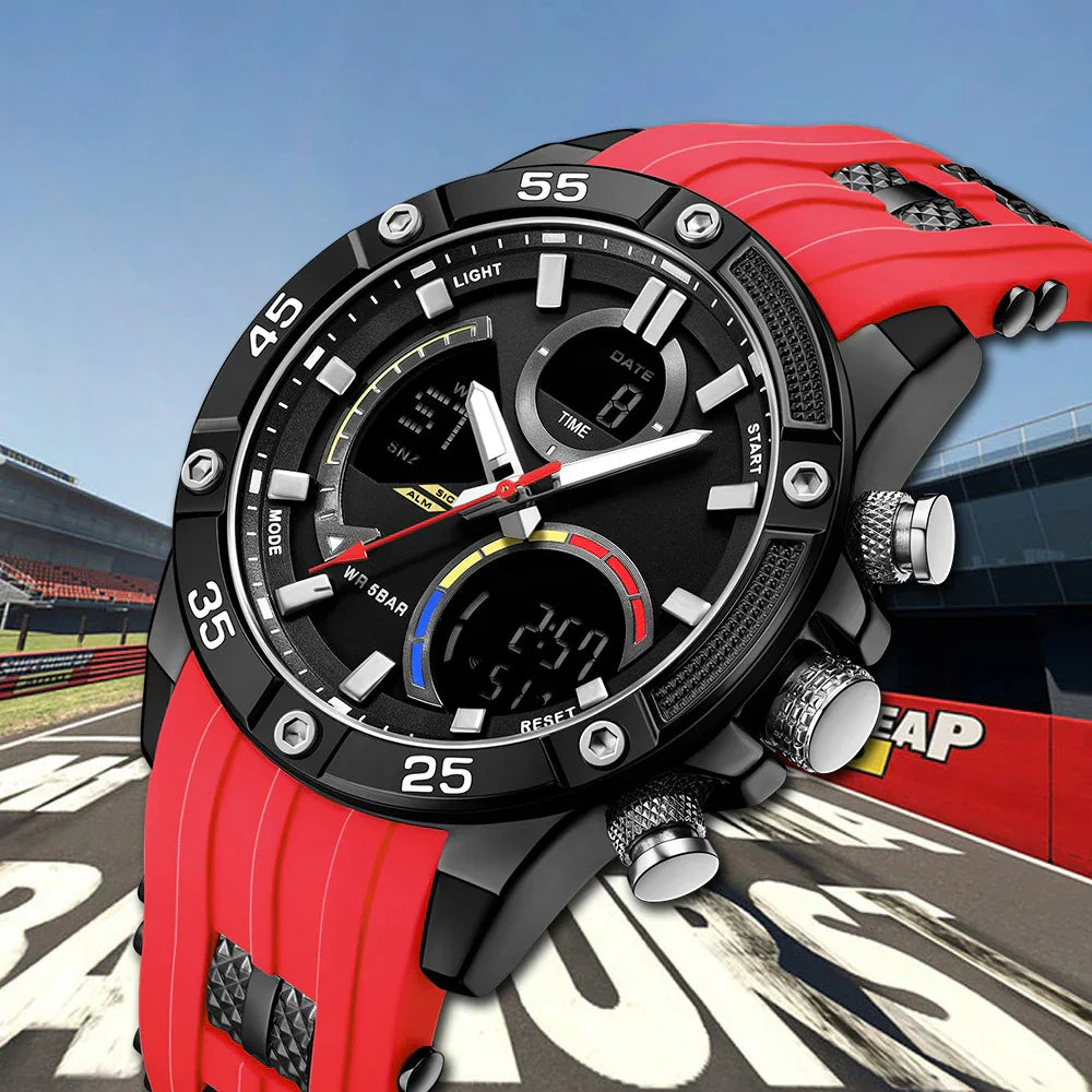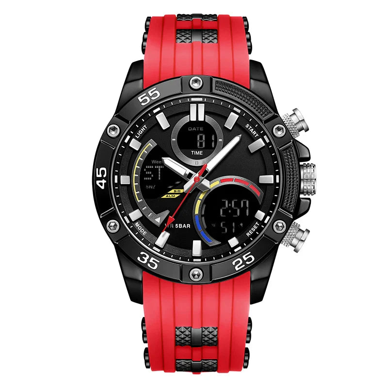 Göz alıcı gül rengi çelik kasası ve siyah kadranı ile modern lüksü yeniden tanımlıyor. Sportif çizgilerle bezeli, çok fonksiyonlu göstergeleri ve analog-dijital hibrit yapısı sayesinde zamanı her açıdan kusursuz şekilde takip edersiniz. 5 Bar su geçirmezlik özelliği ve dayanıklı silikon kordonu ile hem şehir hayatında hem de aktif yaşamda güvenilir bir yol arkadaşınız olur. Estetik ve performansı tek bir saatte buluşturur.